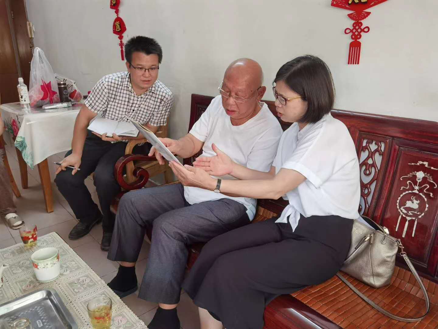 为落实许瑞生副省长关于“华南研学”的工作建议,配合做好华南教育历史研学基地活化利用工作,7月25日,由党委宣传部牵头并组织采访小组开展相关调研。在罗定市社会科学联合会苏智勋主席的推荐下,人文与社会科学学院院长曾秀兰与廖仲恺何香凝纪念馆副馆长刘斌带领采访组拜访了松䓣乡老人黄树鹤先生,了解仲恺农工学校在罗定市松䓣乡办学的相关情况。