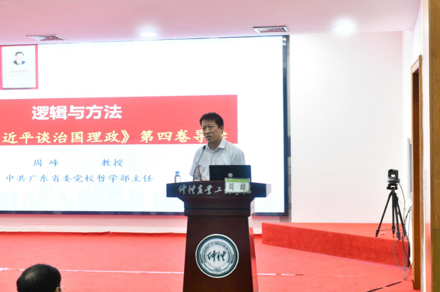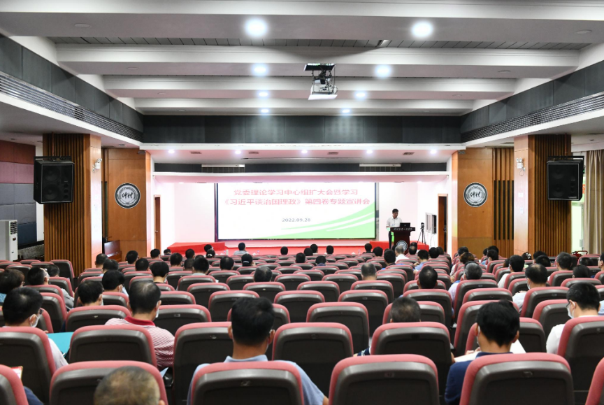9月28日上午,学校于海珠校区学术报告厅召开党委理论学习中心组扩大会暨学习《习近平谈治国理政》第四卷专题宣讲会。广东省理论宣传青年优秀人才、省委党校哲学部主任周峰教授应邀作专题辅导报告。在校校领导、全体中层干部参加会议。会议由学校党委副书记邱亚洪主持。