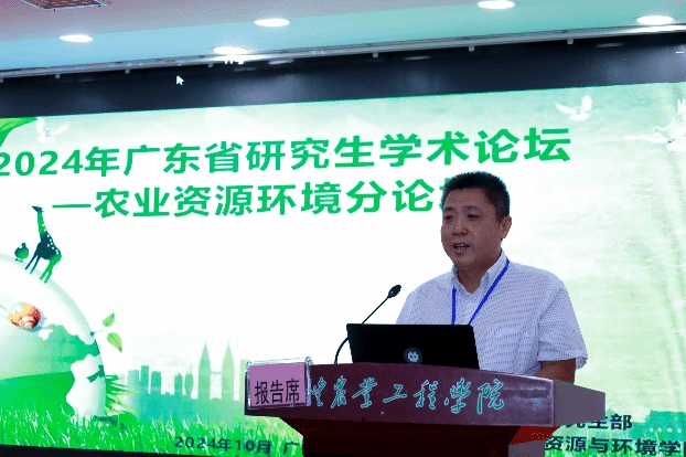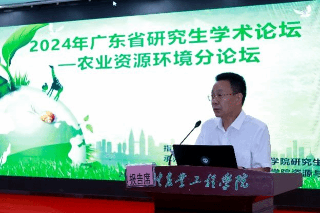 本次论坛的学术委员会主任、华南农业大学资源环境学院院长刘承帅教授致贺辞。他指出,农业生态的减污与降碳是提升农业生产力、保障农产品质量的关键环节,他勉励与会研究生将所学知识与实际问题结合,积极投身到农业生态保护的研究与实践中,为推动我国农业的绿色发展贡献自己的智慧和力量。