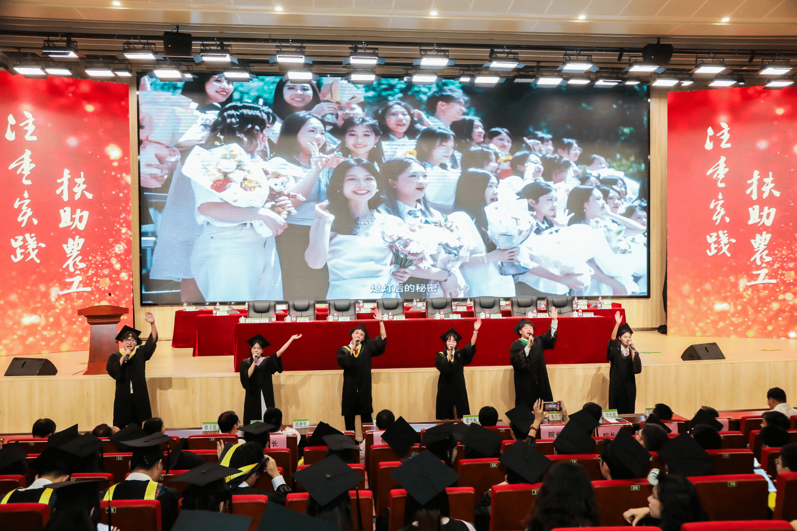 毕业典礼前,毕业生代表们演唱的歌曲串烧,表达了离别的不舍和对未来的憧憬,赢得在场同学们的热烈唱和。