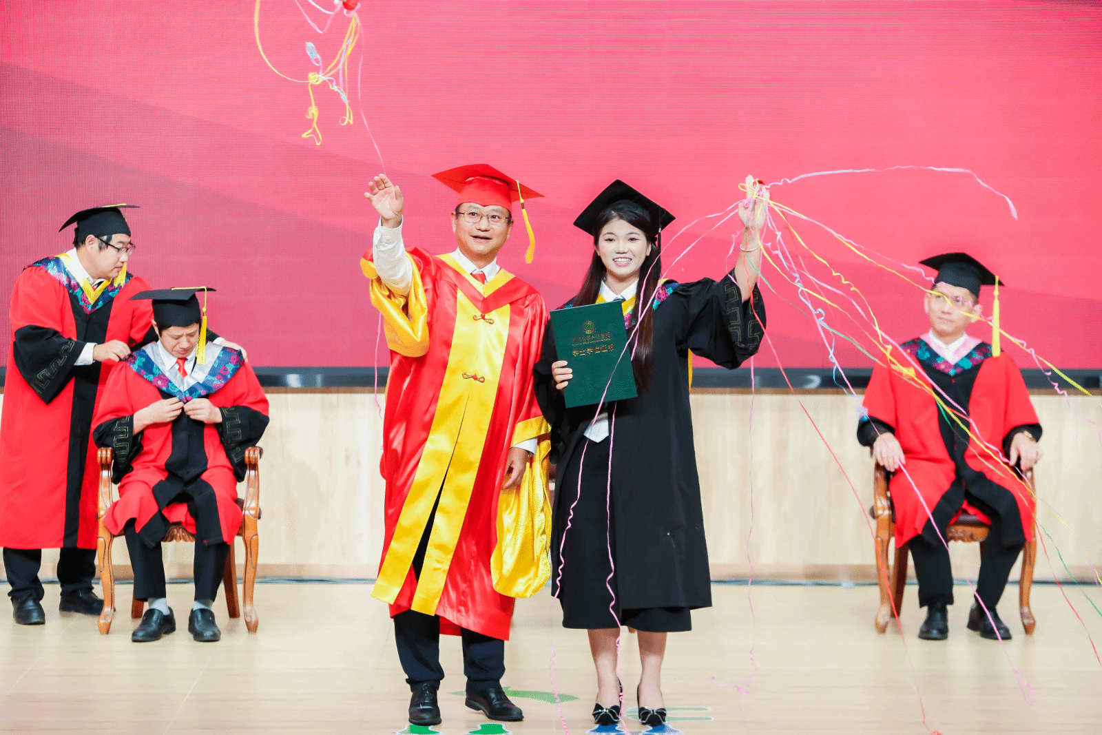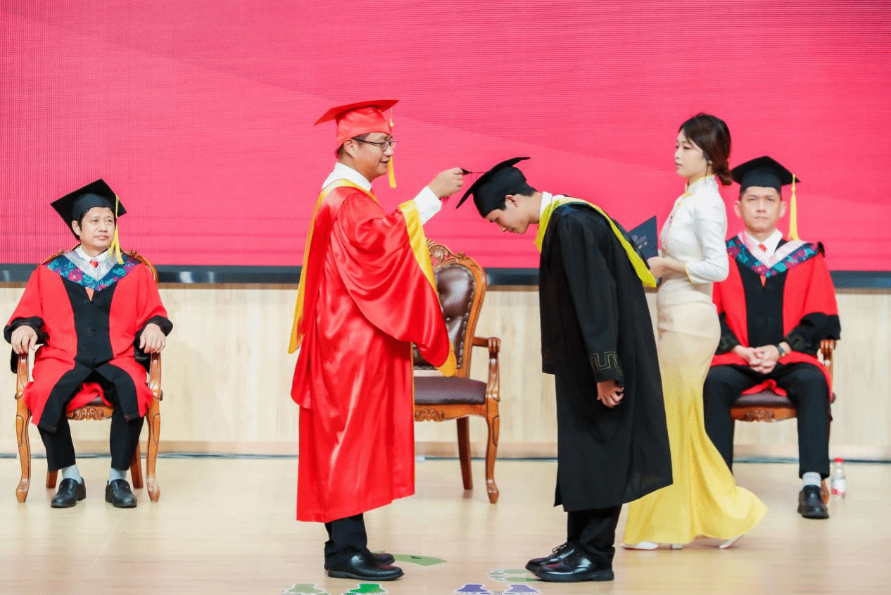 毕业典礼后,学校随即举行2025年学位授予仪式和拨穗礼。报告厅内华光流转,身着学士服的毕业生们踏着沉稳步伐,依次登上主席台。廖明校长微笑俯身,将帽穗从右至左轻轻拨正,动作间饱含期许与祝福。每一次温暖有力的握手,每一句饱含深情的“毕业快乐”,每一个充满力量的拥抱,都化作最真挚的告别仪式。镜头定格的不仅是师生同框的灿烂笑颜,更是人生重要里程碑的永恒见证,将这份独属于盛夏的荣耀与感动,镌刻成永不褪色的青春记忆。
