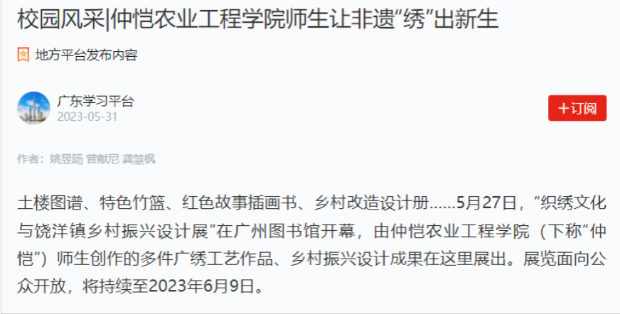 土楼图谱、特色竹篮、红色故事插画书、乡村改造设计册……5月27日,“织绣文化与饶洋镇乡村振兴设计展”在广州图书馆开幕,由仲恺农业工程学院(下称“仲恺”)师生创作的多件广绣工艺作品、乡村振兴设计成果在这里展出。展览面向公众开放,将持续至2023年6月9日。