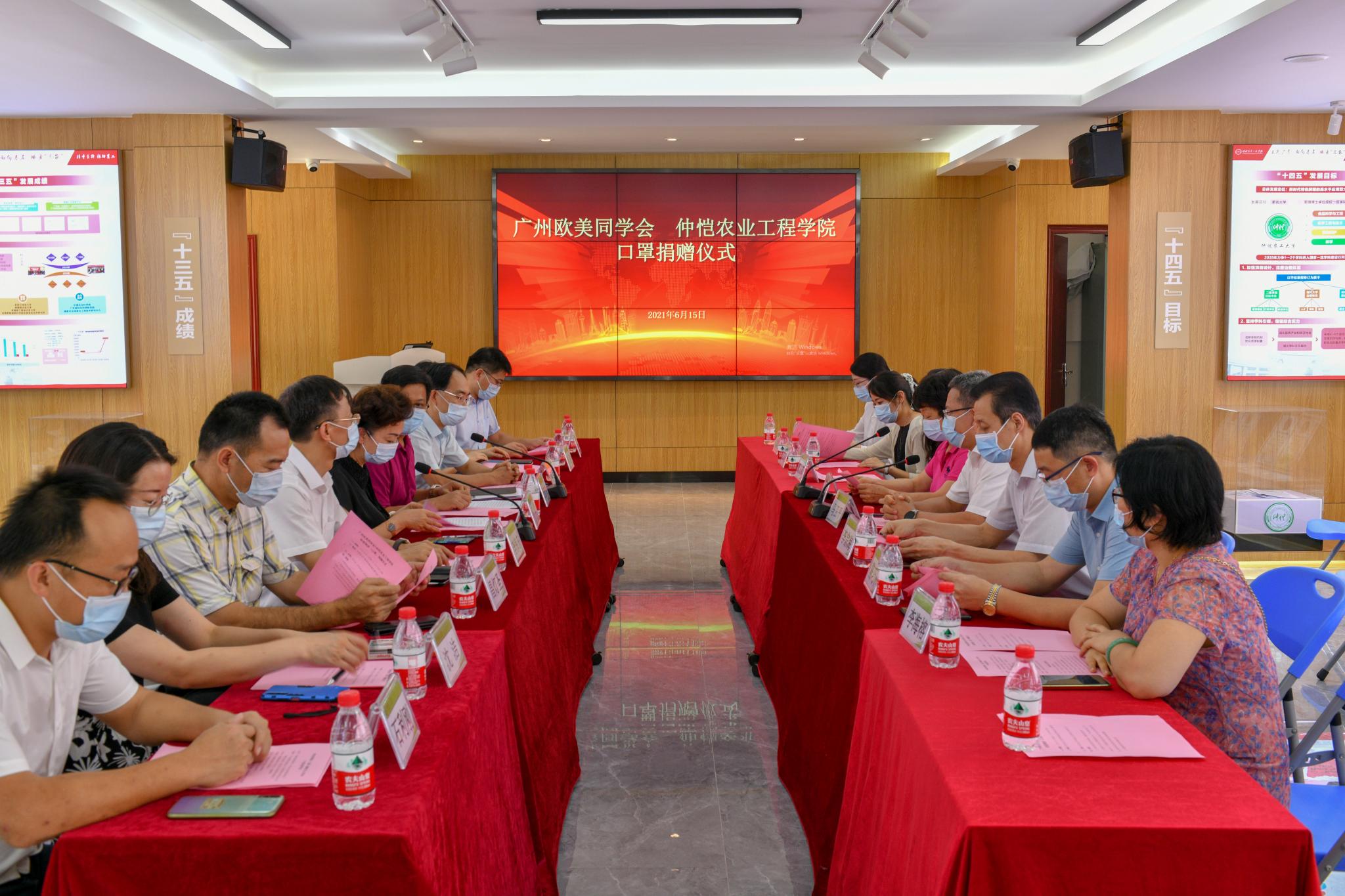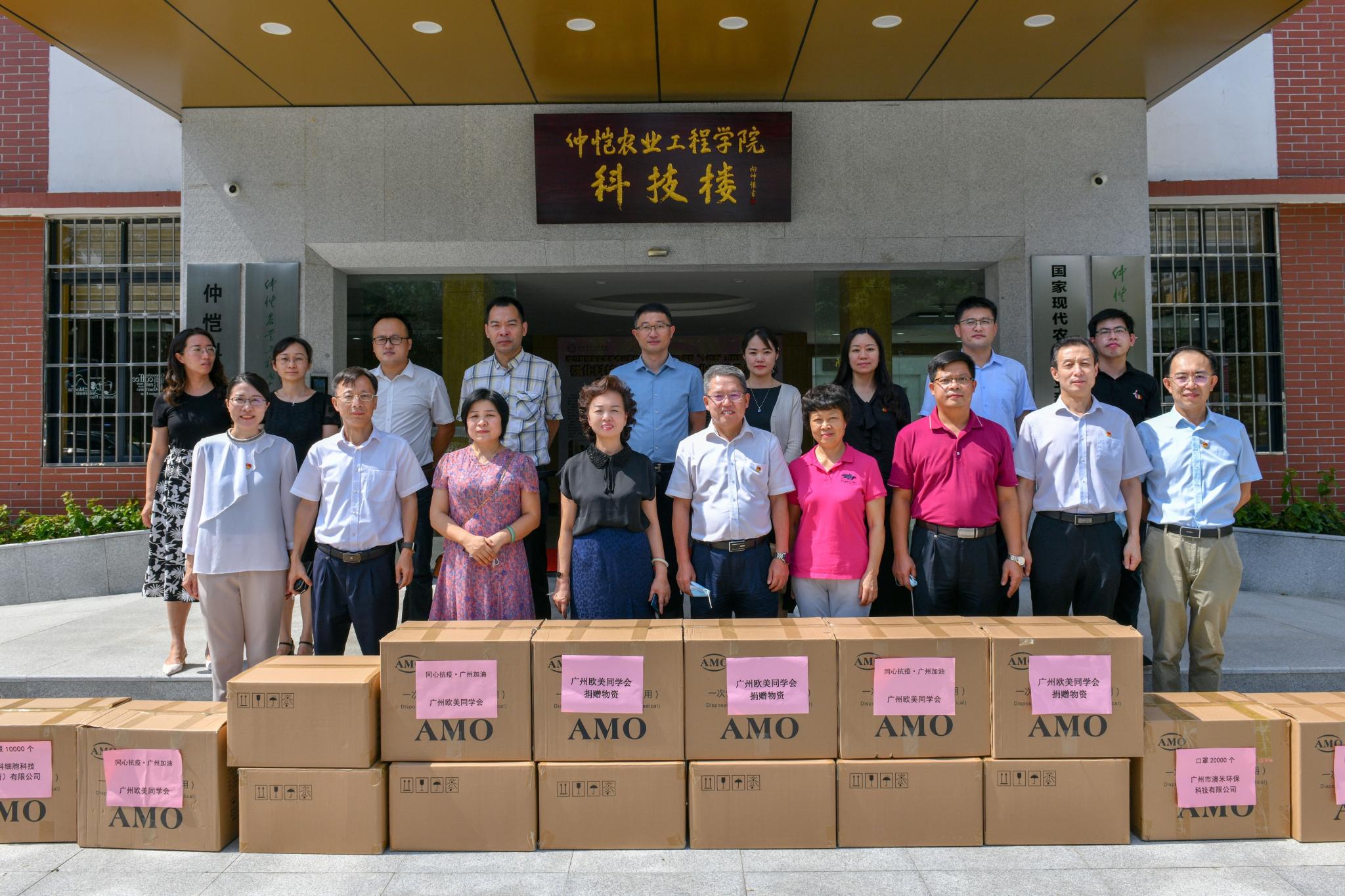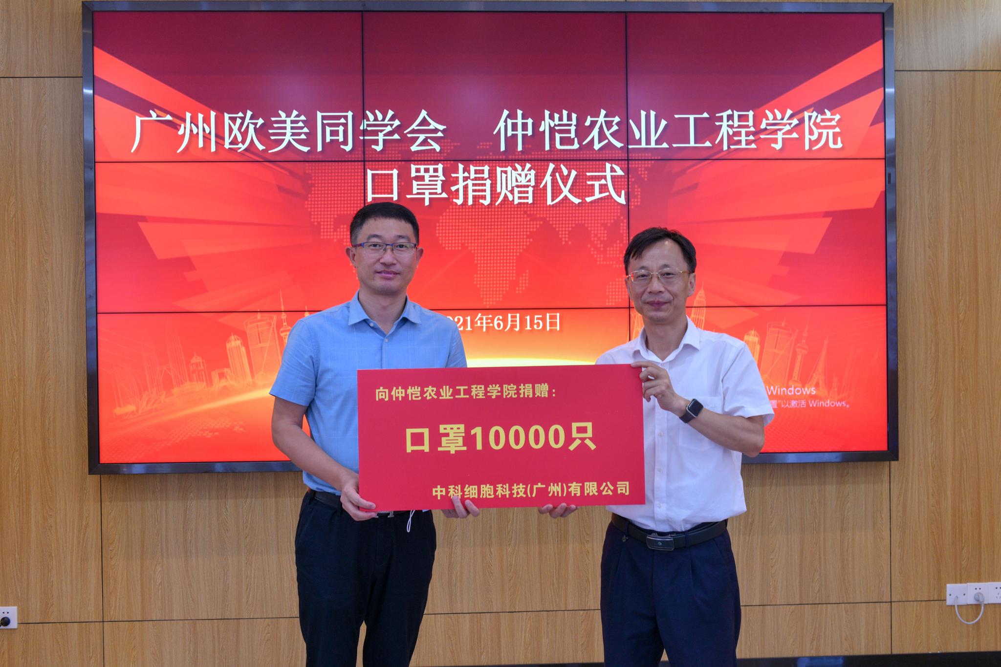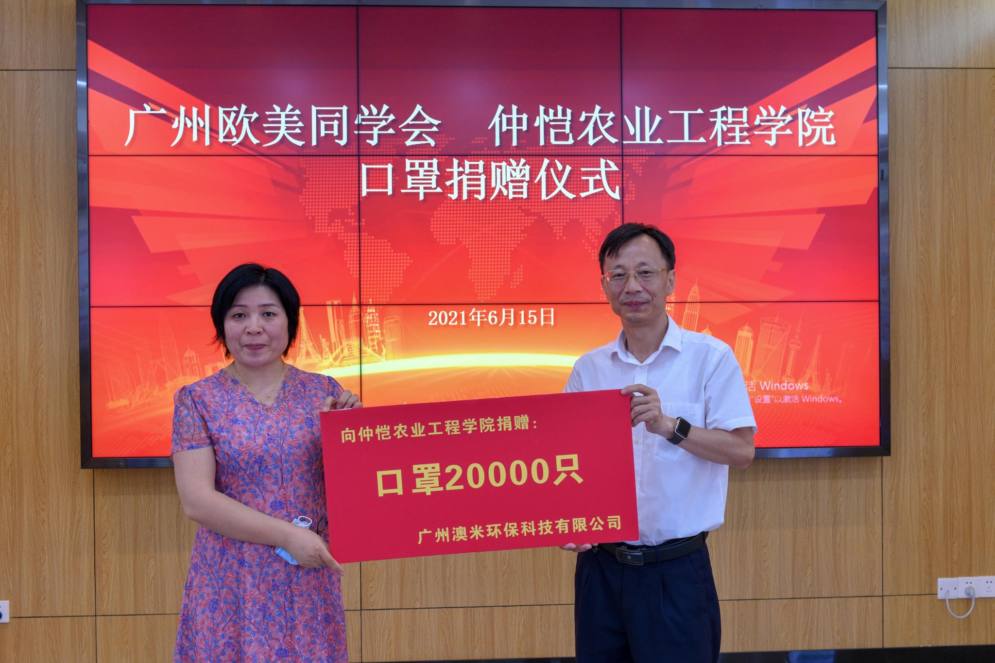 在捐赠仪式上,广州欧美同学会副会长、广州欧美同学会仲恺农业工程学院分会会长向梅梅代表珠江钢管集团公司向仲恺农业工程学院捐赠口罩5万只,广州欧美同学会常务理事陈巧林代表中科细胞科技(广州)有限公司向仲恺农业工程学院捐赠口罩1万只,广州欧美同学会海珠分会理事李海榕代表广州澳米环保科技有限公司向仲恺农业工程学院捐赠口罩2万只。
